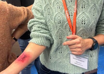 El taller continuó por la tarde, donde el protagonismo lo tuvo un emocionante Scape Room, organizado con la inestimable colaboración de ELSEVIER. Esta actividad permitió a los estudiantes explorar nuevas metodologías para integrar la simulación en la formación de profesionales sanitarios. Posteriormente, los participantes rotaron por tres talleres simultáneos sobre temas clave: pacientes estandarizados/expertos, tipos de simuladores y moulage (la creación de efectos especiales realistas).