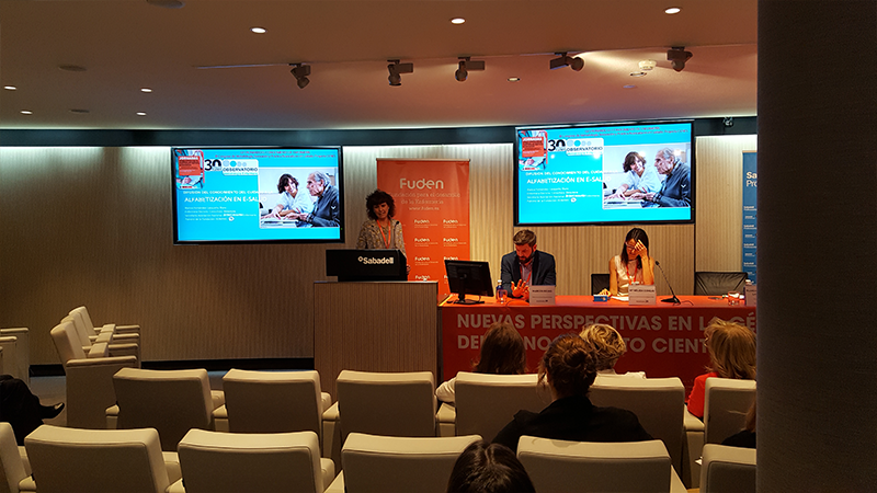 La segunda mesa de expertos «Difusión del conocimiento del cuidado a través de la formación», estuvi moderada por la directora de investigación de FUDEN, Nélida Conejo. En ella participaron Eva García-Carpintero Blas. Prof. Escuela Universitaria de Enfermería Fundación Jiménez Díaz (UAM). Abordó el tema de la Difusión del conocimiento del cuidado en la formación pregrado de Enfermería: “Cómo transmitir la importancia de los lenguajes estandarizados a los futuros profesionales de enfermería” donde destacó que «uno de nuestros retos es conseguir que nuestros estudiantes integren lenguajes estandarizados con la práctica clínica». Marcos Rojas. Director de la Escuela de Postgrados de Fuden. Rojas abarcó la difusión del conocimiento del cuidado en la formación postgrado de Enfermería. La directora de EnferConsultty, Blanca Fernández-Lasquetty Blanc, expuso la «Difusión del conocimiento del cuidado en la población: “Alfabetización en salud”.