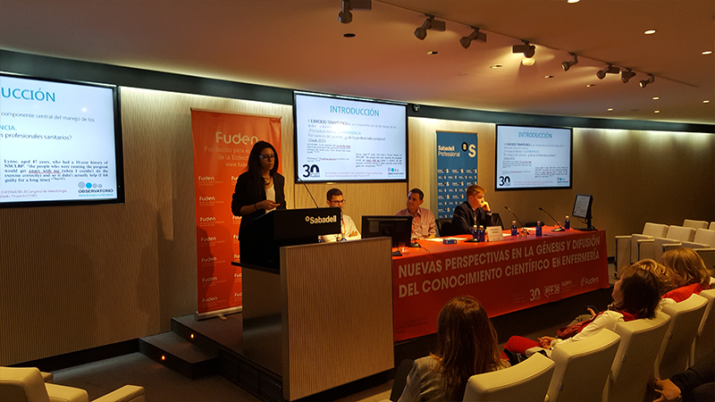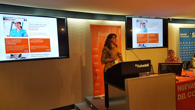 Miriam Hernández Mellado. Enfermera e Investigadora del Proyecto CENES. Fue la encargada de exponer las diferentes novedades del Proyecto CENES, la utilización de la guía diagnóstica recogida en nuestra web, www.fuden.es. Y Antonio Arribas, el responsable de Fuden Metodología, mostró a los asistentes la última novedad publicada por su departamento en www.fuden.es: la BASE NORMALIZADA DEL CONOCIMIENTO DE ENFERMERÍA.