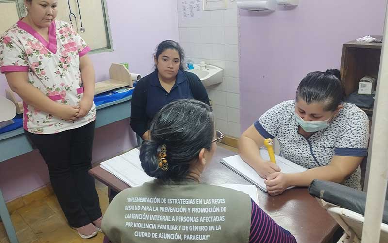 La puesta en marcha del proyecto «Implementación de estrategias en las Redes de Salud para la prevención y promoción de la atención integral a personas afectadas por violencia familiar y de género en Asunción” ha incluido su presentación ante diversos directivos de hospitales y Unidades de Salud Familiar (USF) de la XVIII Región Sanitaria de Paraguay. Las enfermeras facilitadoras y el equipo del proyecto han visitado las 33 USF de la región para implementar una encuesta para recopilar datos actualizados sobre los conocimientos, actitudes y prácticas del personal sanitario en la prevención, detección y tratamiento de los casos de violencia que llegan al sistema sanitario público.