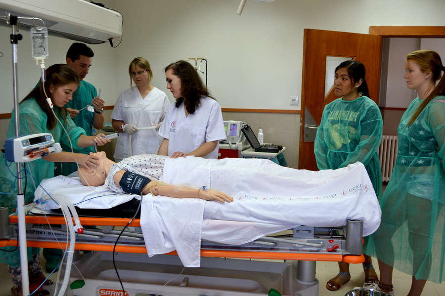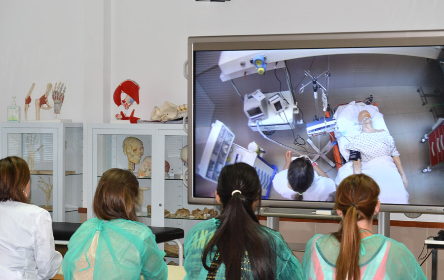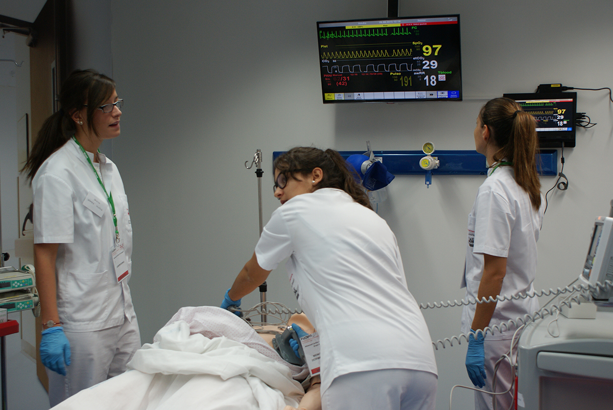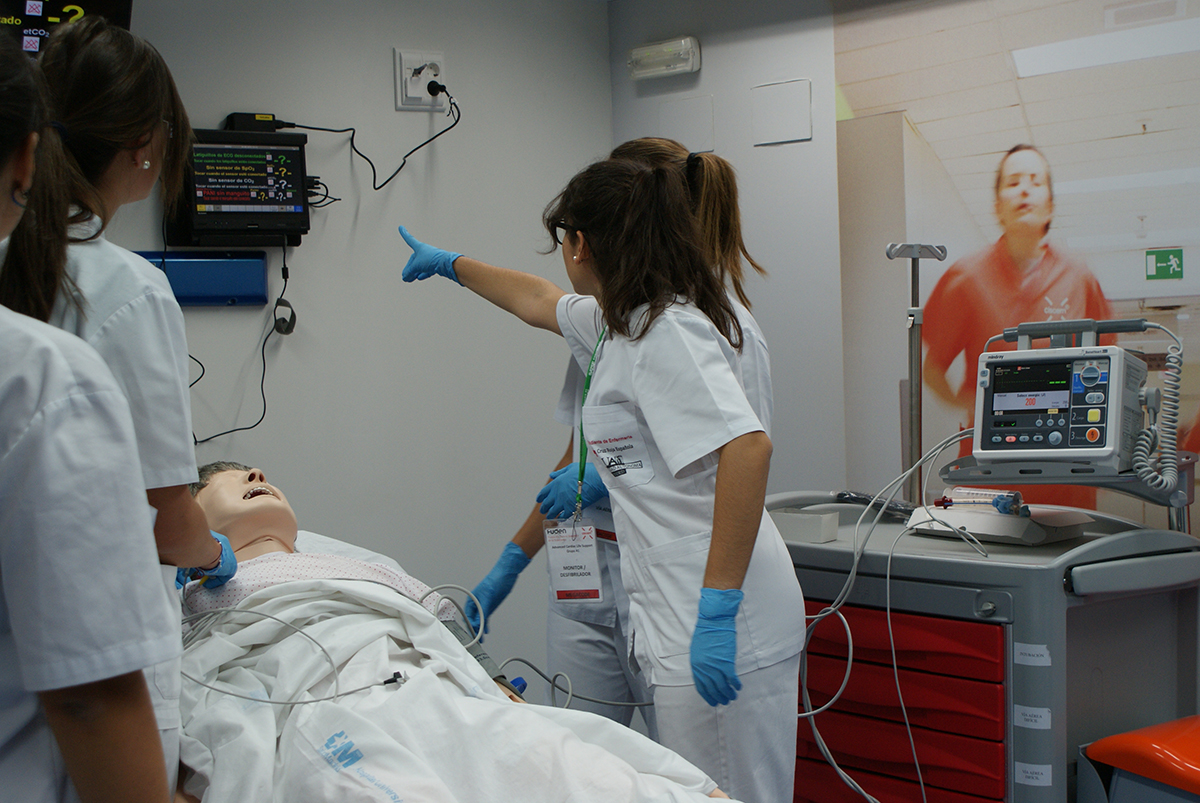 La parte práctica tiene lugar en aulas de simulación clínica. Se trata de aulas en las que se han recreado espacios en donde los enfermeros se enfrentan a este tipo de situaciones, como un box de urgencia o una UVI móvil, que cuentan con maniquíes de alta fidelidad y con el aparataje necesario para afrontar situaciones comunes o extremas. En este espacio se plantean todo tipo de casos para afianzar los contenidos teóricos y practicar las habilidades en equipo.