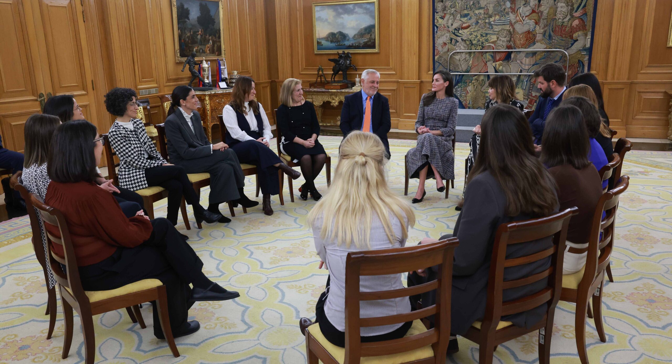 La audiencia, celebrada este martes 27 de enero, sirvió para que el presidente, Víctor Aznar; la directora ejecutiva, Amelia Amezcua y distintos representantes de la Fundación para el Desarrollo de la Enfermería presentasen a Su Majestad los proyectos que la institución impulsa en liderazgo, formación, cooperación, investigación y divulgación en torno al derecho a la salud y, especialmente, al derecho al cuidado. Tras el saludo protocolario, S.M. la Reina posó con los representantes de Fuden para la foto de familia y, posteriormente, les invitó a tomar asiento para participar en una conversación en formato coloquio, cercana y distendida.